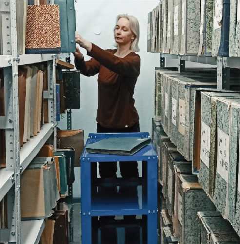 Главный архивист Н. Г. Лисевич в хранилище Научного архива ФИЦ Коми НЦ УрО РАН (2023).