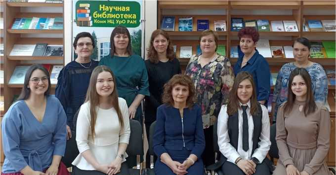 Staff of the Scientific Library at the Federal Research Centre, Komi Science Centre of the Ural Branch RAS (2024). From left to right, first row: I. V. Gorbachenko, E. N. Chugaeva, E. A. Bergman (Head of the library from 2008 to present), D. V. Menshenina, N. S. Panyukova; second row: G. E. Shikiryavaya, E. S. Denisova, N. V. Nesterova, E. V. Shebunova, S. B. Mukhacheva, I. G. Zhukova.