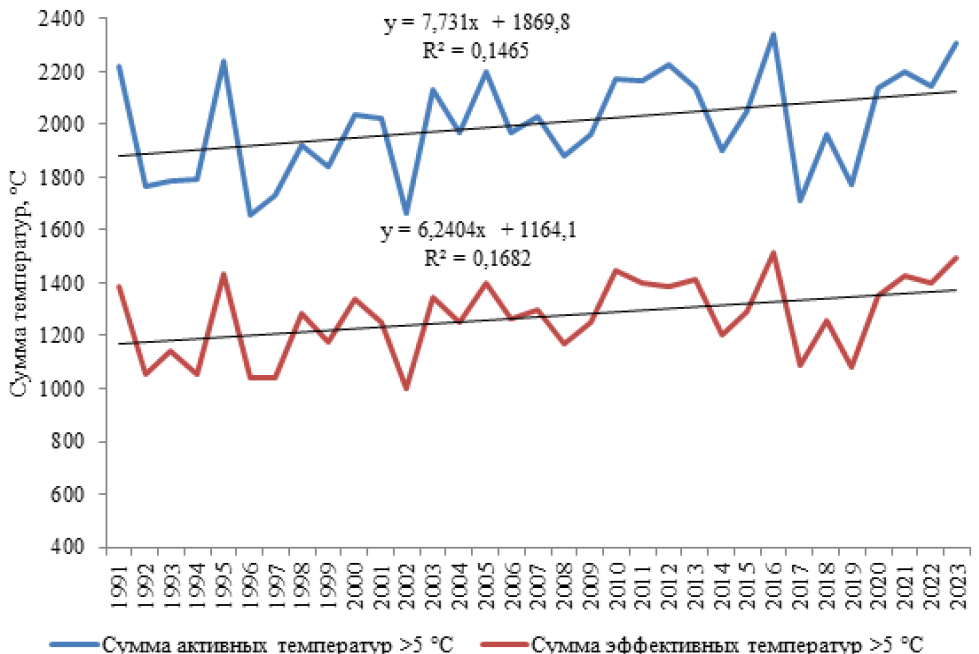 Figure 5. Dynamics of the sums of active and effective temperatures above 5° C for the vegetation periods of 1991–2023.