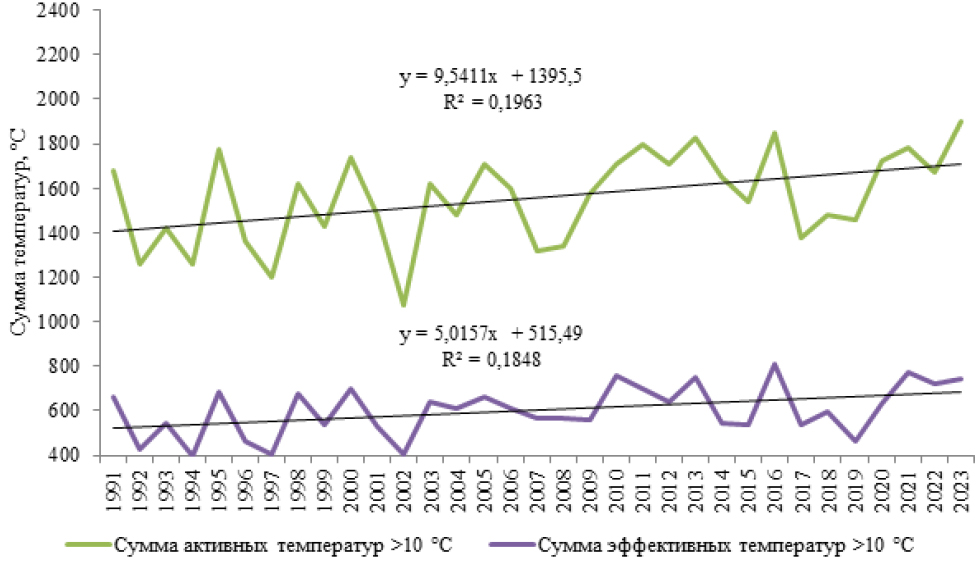 Figure 6. Dynamics of the sums of active and effective temperatures above 10° C for the vegetation periods of 1991–2023.