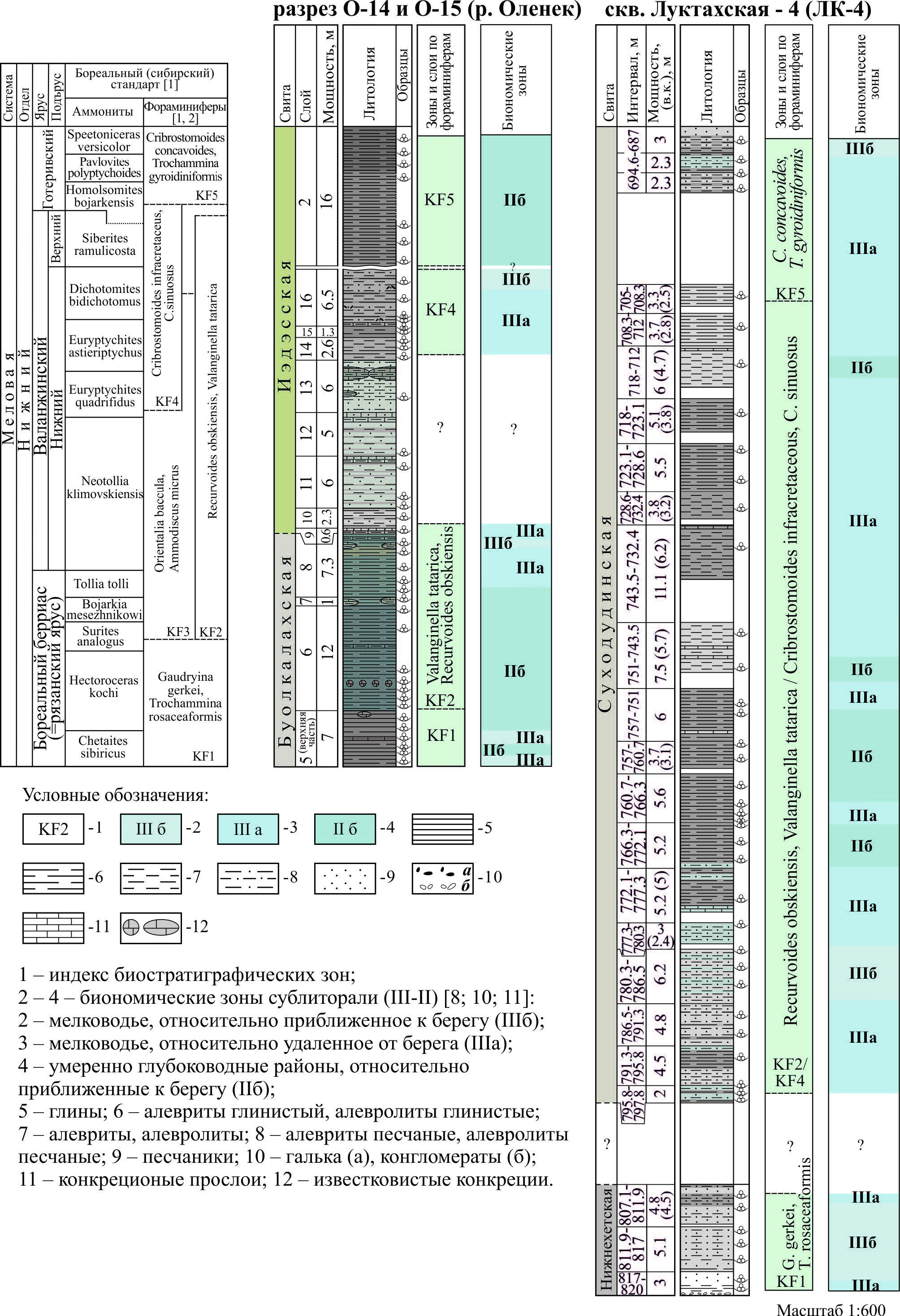By the analysis of foraminifera distribution in the Lower Cretaceous sections of the Luktakhskaya-4 well (Central Taimyr) and natural outcrops in the lower reaches of the Olenek River, we identified a sequence of five biostratons: Gaudryina gerkei, Trochammina rosaceaformis zone (KF1, middle Boreal Berriasian); Valanginella tatarica, Recurvoides obskiensis zone (KF2, uppermost Boreal Berriasian – Valanginian); Cribrostomoides infracretaceous, Cribrostomoides sinuosus zone (KF4, upper Lower Valanginian – lowermost Hauterivian); beds with Cribrostomoides concavoides, Trochammina gyroidiniformis (KF5, lower Hauterivian) (based on [1, 2]).