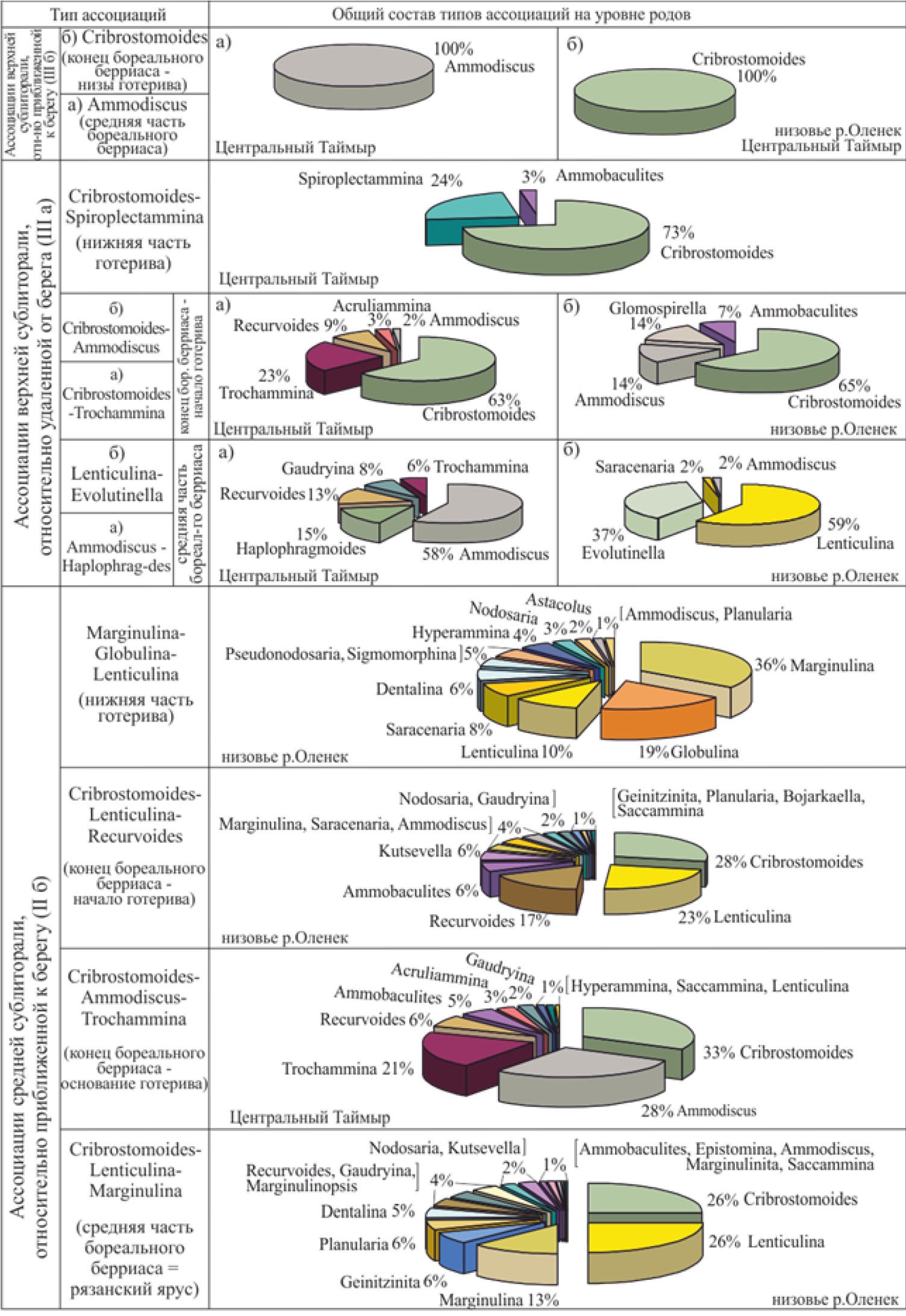 Общий систематический состав фораминифер свидетельствует, что в течение бореального берриаса, валанжина и раннего готерива на территории Енисей-Хатангского пролива (Центрального Таймыра) и Северо-Сибирского моря (район нижнего теченья р. Оленек) существовал относительно мелководный морской бассейн. В большинстве случаев на изученной территории установлены ассоциации фораминифер, характерные для верхней сублиторали (см. рис. 2). На небольшие глубины палеобассейна указывают широкое развитие бентосных агглютинирующих фораминифер с толстостенной раковиной довольно крупных размеров, присутствие в ассоциациях небольшого количества известкового бентоса. В прибрежно-мелководной части моря, в условиях подвижной гидродинамики, обитали представители агглютинирующих родов Ammodiscus, Cribrostomoides, образовывающие практически моновидовые сообщества микробентоса. В мелководной зоне комплексы фораминифер немногочисленны, отличаются обедненным составом (2–4 рода из 2–3 семейств), среди встреченных здесь форм в изученных разрезах преобладают представители Cribrostomoides, Ammodiscus, Lenticulina, занимая в сообществах 60–80 %.