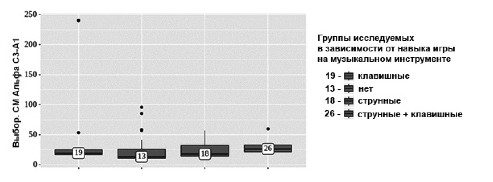 Рис. 1. Анализ спектральных параметров ЭЭГ головного мозга в альфа-диапазоне в отведении C4-A2 в зависимости от наличия навыка игры на музыкальных инструментах у исследуемых лиц. Цифрами здесь и на рис. 2 обозначены показатели медианы (Ме) значений спектральной мощности нейронов по группам исследуемых