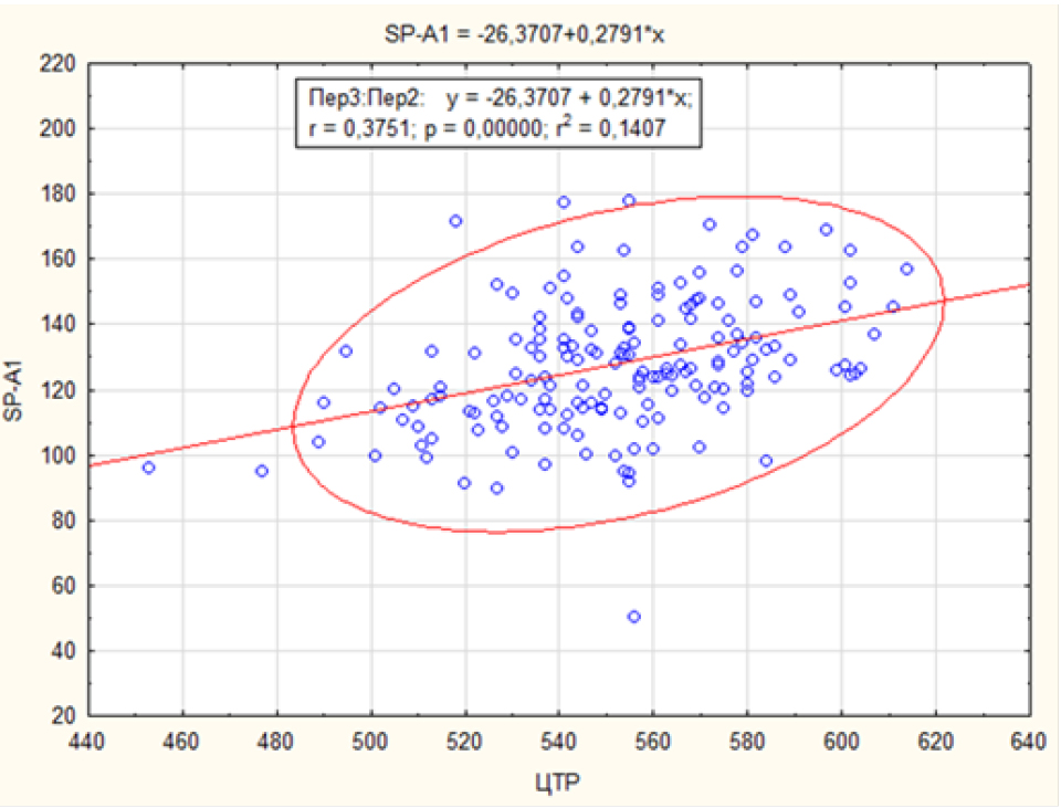 При изучении показателей в группе с кератоконусом была выявлена прямая зависимость параметра жесткости роговицы SPA1 от ее минимальной толщины как при начальных стадиях заболевания: r = 0,51, р = 0,05, так и при 3-й стадии: r = 0,57, р = 0,0020. При проведении корреляционного анализа для всей группы была выявлена прямая зависимость параметра жесткости роговицы SPA1 от ее минимальной толщины: SPA1 = -114,5519 + 0,3817 × ЦТР. Коэффициент корреляции r x/y был равен 0,68; р = 0,00000. С увеличением толщины роговицы возрастало значение жесткости роговицы (рис. 4).
