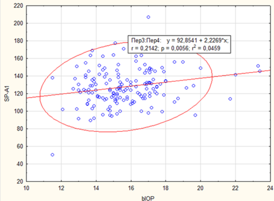Отмечена прямая корреляционная зависимость показателя жесткости роговицы от величины биомеханически компенсированного внутриглазного давления (bIOP). С увеличением уровня внутриглазного давления повышалась жесткость роговицы: SPA1 = 92,85 + + 2,23 × bIOP. Полученные результаты согласуются с данными литературы [17]. Коэффициент корреля-ции r x/y был равен 0,21; р = 0,005 (рис. 2).