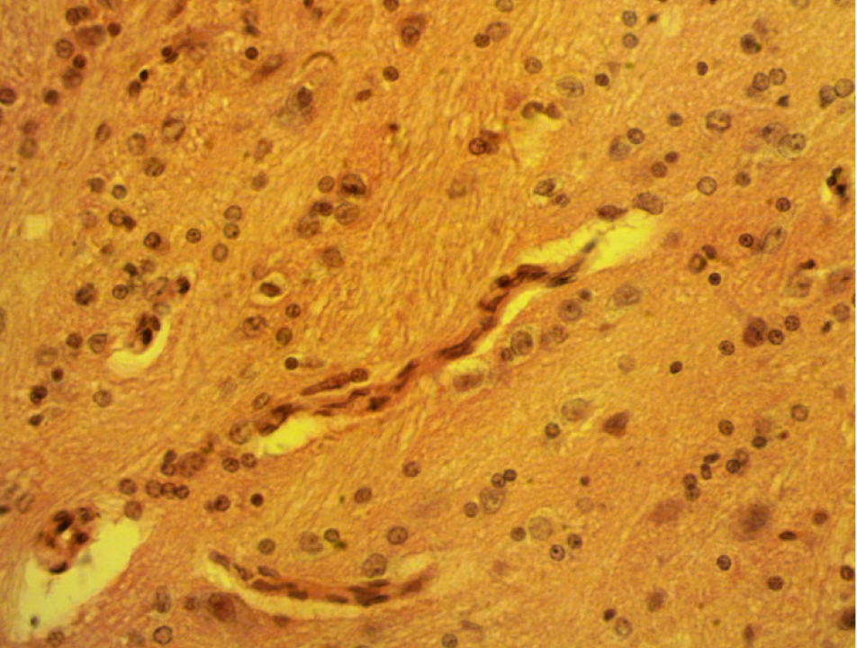 Наряду с приспособительными, компенсаторными, встречаются патологические изменения со стороны нейронов и нейроглии мозжечка при ЧМТ в высокогорье. В основе этих изменений нарушение функции и регуляции ионных насосов, каналов и других транспортеров при ЧМТ и гипоксии различного происхождения. На гистологических препаратах это проявляется цитотоксическим, ионным, вазогенным отеками и геморрагической конверсией в определенной последовательности, локализованных на ограниченных участках отдельных долек мозжечка. Согласно литературной сводке [32] патогенез отеков и геморрагической конверсии «обусловлен патологическими изменениями трансмембранной проницаемости нейронов, глии и эндотелиальных клеток сосудов нейроглиоваскулярного блока». «Аномальный ионный поток через ионные каналы и вторичные активные транспортеры играет центральную роль в развитии цитотоксического и ионного отека, что в конечном итоге приводит к вазогенному отеку и геморрагической конверсии».