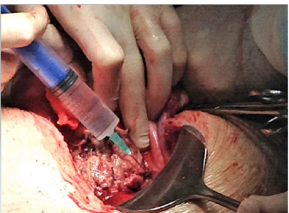 Методика профилактики ранений мочевого пузыря защищена патентом РФ (№ 2658457 от 21 июля 2018 г.). После вскрытия брюшной полости проводили ревизию зоны нижнего сегмента матки с целью оценки тяжести спаечного процесса и выбора места для рассечения полости матки и извлечения плода. В случаях высокого расположения дна мочевого пузыря вследствие перитонизации при предыдущей операции выполняли мобилизацию мочевого пузыря, отделяя его от стенки матки. Для этого проводили гидропрепаровку паравезикальной клетчатки 0,5%-м раствором новокаина 20 мл, который вводили под пузырно-маточную складку со стороны круглых связок матки по 10 мл с каждой стороны (рис.).