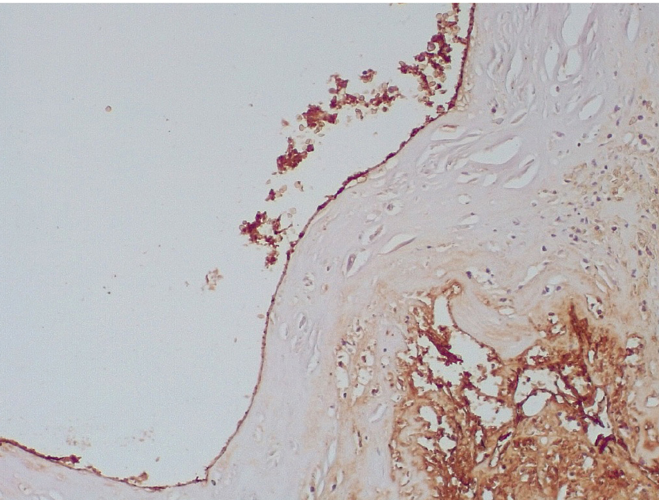 Обращало внимание, что в местах «оголенного» эндотелия КА отмечалась слабая экспрессия белка CD31, что указывало на выраженные дистрофические и некробиотические изменения клеток (рис. 2). При этом экспрессия ФВ была яркой, выраженной на всем протяжении интимы КА (рис. 3).