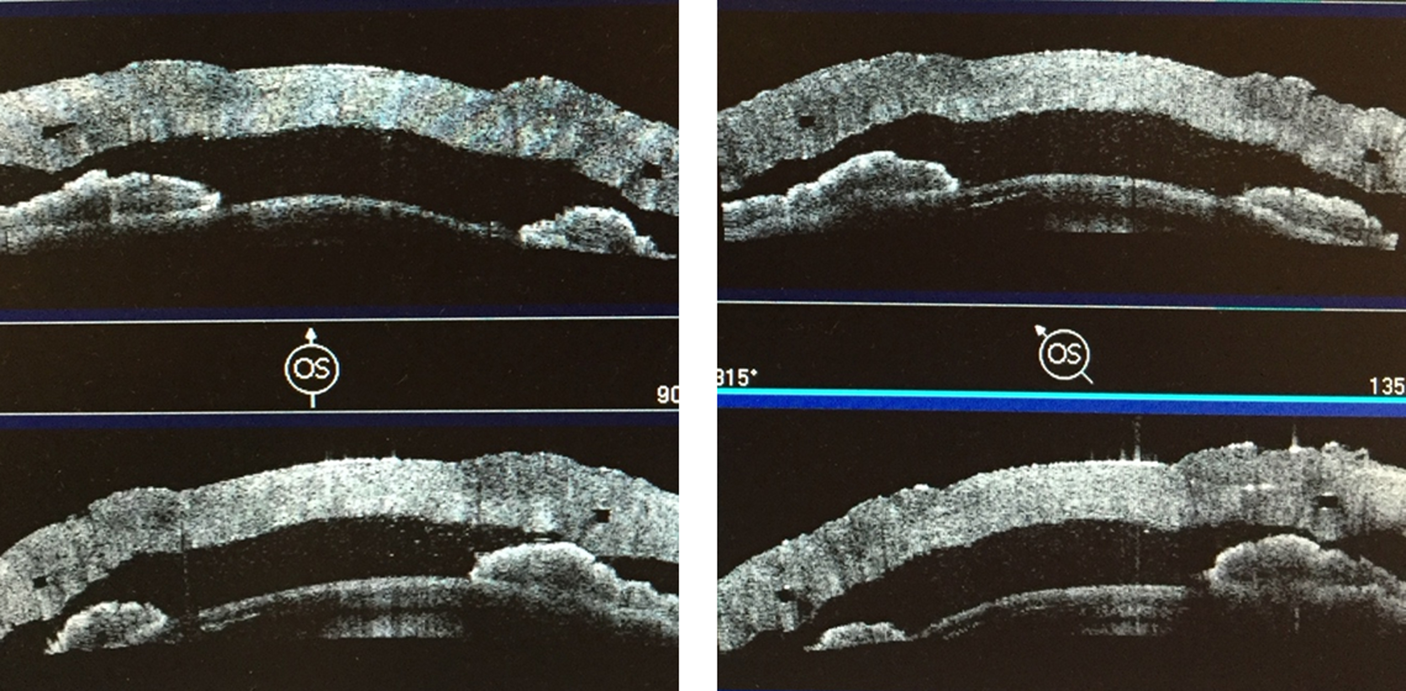Рис. 5. Положение интрастрамального кольца в 4 меридианах в строме роговицы кадаверного глаза по данным оптической когерентной томографии