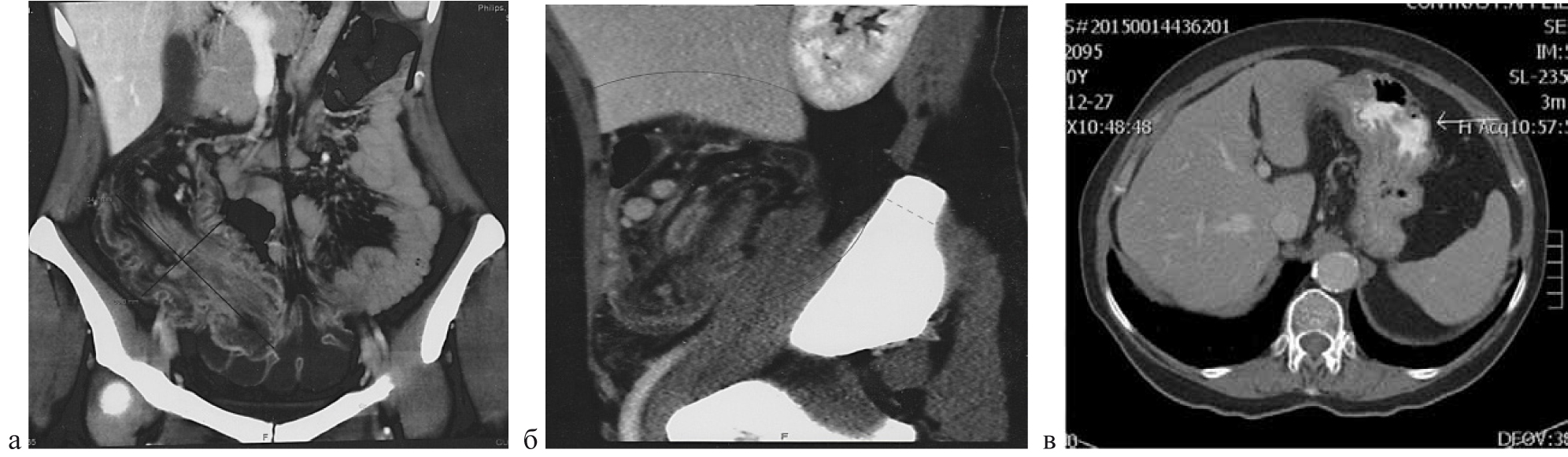 Рис. 5. МСКТ брюшной полости в режиме ангиографии: а) эндофитная опухоль в инвагинате; б) лимфома подвздошной кишки; в) аденокарцинома двенадцатиперстной кишки