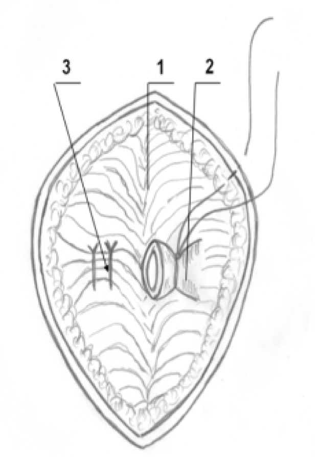 Рис. 5. Схема операции LIFT+: 1 – межсфинктерное пространство; 2 – проксимальная культя свищевого хода; 3 – ушитый дефект наружного анального жома после иссечения дистальной части свищевого хода