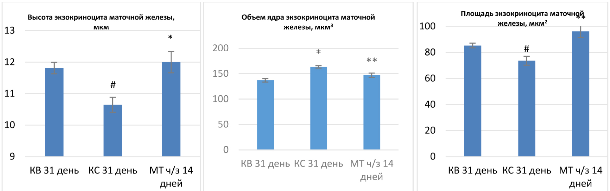 При гистологическом исследовании маточных желез были выявлены следующие изменения: увеличение высоты, площади секреторных эпителиоцитов маточных желез на 13,2 % (p < 0,05) и 30,7 % (p < 0,01) соответственно. Одновременно уменьшается объем их ядер на 10 % (p < 0,01) по сравнению с опытной группой (рис. 2).
