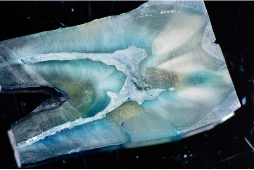 На следующем этапе исследования образцы зубов были разрезаны по сагиттали для изучения глубины проникновения красящего вещества между реставрациями (вкладками и пломбами) и стенкой зуба. В процессе выполняемой работы велся фотопротокол каждого этапа. Фотографии выполнены при увеличении в 20 раз.