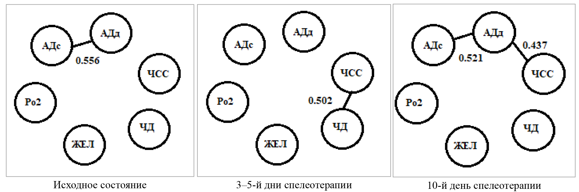 В дни наибольшего дисбаланса параметров сердечно-сосудистой и дыхательной системы выявлена значимая корреляционная связь между частотой дыхания и частотой сердечных сокращений (межсистемная корреляционная связь). Отметим, что именно эти признаки – ЧСС и ЧД – оказались наиболее чувствительны к воздействию спелеоклимата.