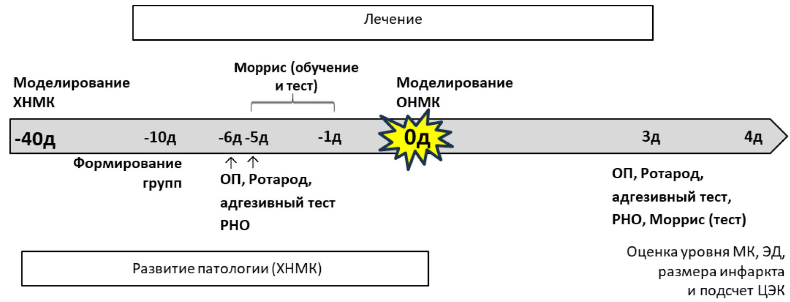 Дизайн исследования. На первом этапе исследования экспериментальным животным проводили моделирование ХНМК путем стеноза общих сонных артерий на 50 % [9]. Хирургические манипуляции выполнялись под наркозом: комбинация золетила 20 мг/кг (Zoletil®100, Valdepharm, France) и ксилазина 8 мг/кг (Xyla, Interchemie, Netherlands). Далее в течение 30 дней животные находились в стандартных условиях вивария без фармакологической терапии. В этот период ГМ животных находился в условиях хронической ишемии, результатом чего явилось формирование ряда умеренных неврологических нарушений, проявляющихся в том числе в виде сенсорно-моторных и когнитивных расстройств. Далее, животные начали получать терапию исследуемым соединением и препаратом сравнения. Через 10 дней терапии выполнялось моделирование острого НМК посредством 60-минутной ОСМА [9]. Затем терапия продолжалась 3 дня, после чего проводилась оценка эффективности лечения (рис. 2).