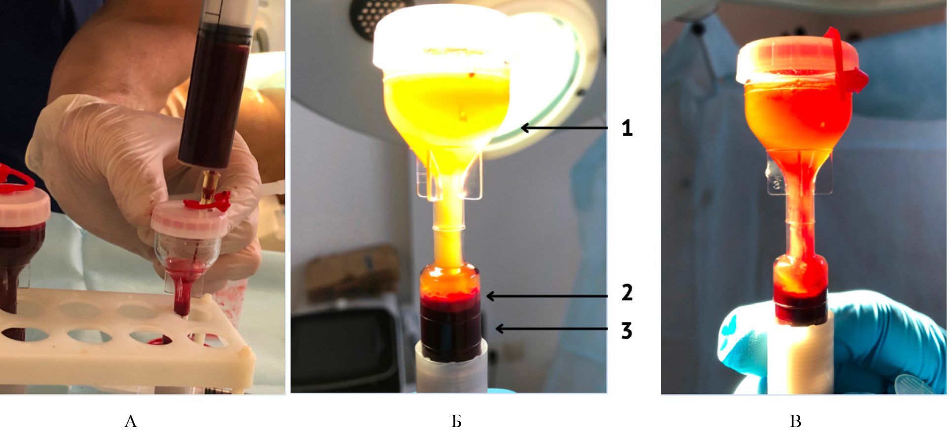 Рис. 3. Работа с аспиратом после забора: А – помещение аспирата в пробирки YCELLBIO; Б – разделение на фракции (1 – плазма, 2 – фракция с высоким содержанием мезенхимальных клеток, 3 – эритроцитарная масса); В – центрирование концентрата костного мозга в перешейке пробирки методов вращения поворотного колпачка
