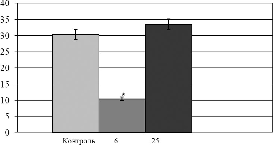 Рис. 2. Динамика митотической активности в базальном слое эпителия. По оси ординат: митотическая активность (в ‰). По оси абсцисс – значение показателя: К – контрольная группа, 6 – 6-е сутки эксперимента, 25 – 25-е сутки эксперимента