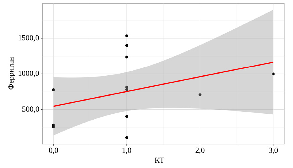 Наблюдается положительная корреляционная связь между уровнем ферритина и стадии КТ (рис. 1).