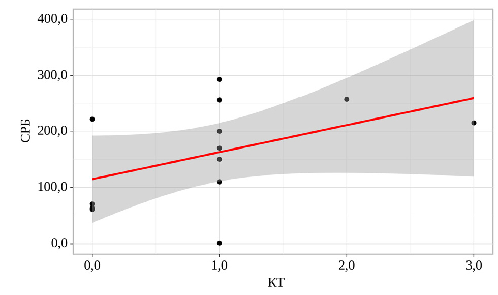 Рис. 2. Корреляционная связь между уровнем СРБ и стадии поражения легких (по КТ)