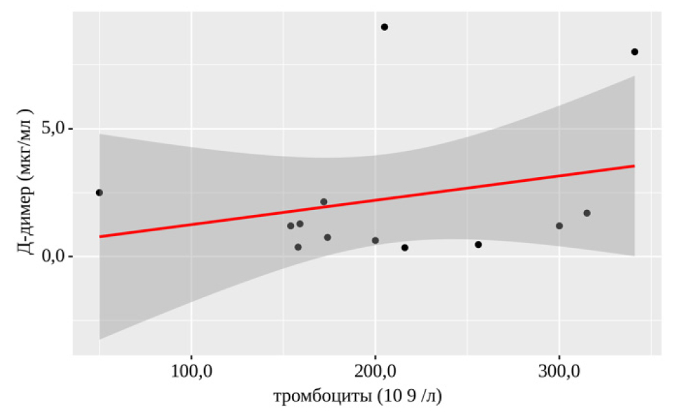 По результатам нашего исследования наблюдаемая зависимость Д-димера от числа тромбоцитов положительно коррелируют у пациентов с COVID-19 и ишемическим инсультом (рис. 3).
