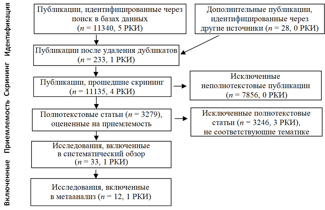 Этапы поиска доказательной базы на рисунке. В систематический обзор включено 33 исследования (РКИ – 1, проспективные – 5, комбинированные – 1 (про- и ретроспективное), проспективные когортные – 5, комбинированные когортные – 2, ретроспективные – 9, ретроспективные когортные исследования – 4, серия случаев – 1, описание клинических случаев – 5). Когортные исследования (12), включая 1 РКИ, включены в МА [15].