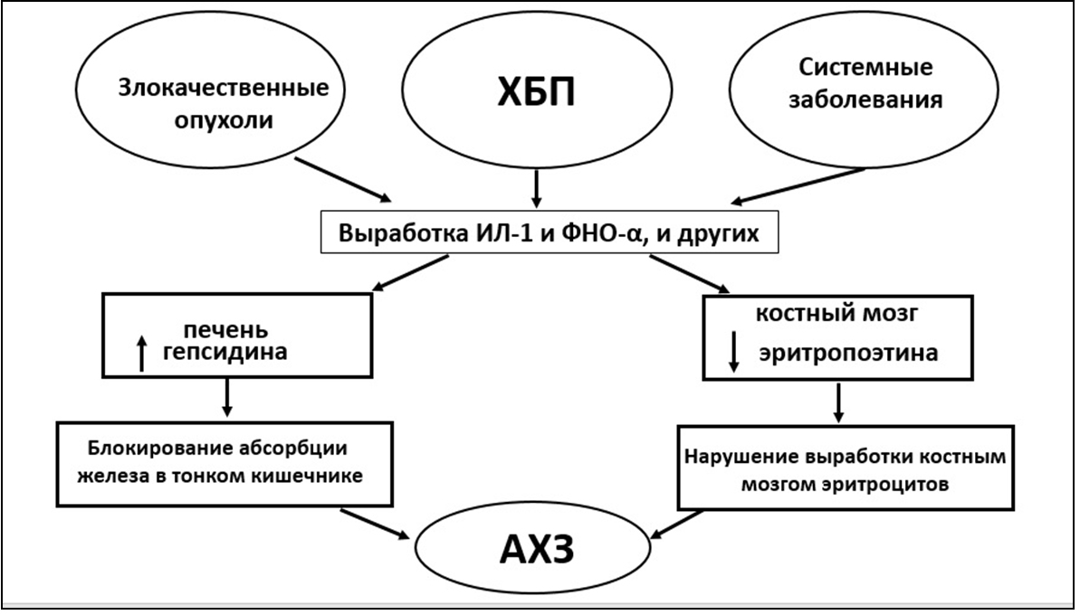 На фоне различных патологических процессов (воспалительных, онкологических и аутоиммунных заболеваний) происходит активация T-клеток и моноцитов, которые продуцируют различные провоспалительные цитокины: ИФН-γ, ФНО-α, ИЛ-1, ИЛ-6, ИЛ-10. Под их действием повышается уровень секреции гепсидина, что в свою очередь приводит к уменьшению абсорбции железа из просвета тонкого кишечника и соответственно снижению концентрации железа в крови. Это, в свою очередь, является одним из ведущих факторов, приводящих к нарушению функции эритропоэза [1, 3].