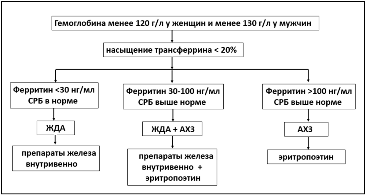 При оценке показателей результатов клинического анализа крови не всегда возможно отдифференцировать ЖДА и АХЗ, в большинстве случаев в дебюте заболевания АХЗ обычно нормохромная и нормоцитарная, легкой или средней степени тяжести в зависимости от прогрессирования основного заболевания, но по мере течения заболевания она приобретает гипохромный и микроцитарный характер, что характерно для ЖДА [1, 3].