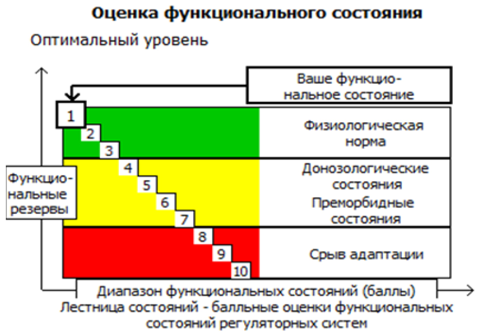 Оценка уровня адаптации и здоровья проводилась с помощью интегративной характеристики «функциональный класс организма», основанной на учении Казначеева В.П. о донозологических адаптационных состояниях, переходных от здоровья, как высокого функционального класса организма, к истощению и срыву адаптационных возможностей и переходу к болезни [8]. Метод ВСР, разработанный Казначеевым В.П. и Баевским Р.М. и основанный на компьютерных технологиях, позволяет оценить не только регуляторные влияния ВНС и ЦНС на функциональные перестройки ССС под влиянием двигательных нагрузок при занятиях ФК, но и физиологическое состояние всего организма.