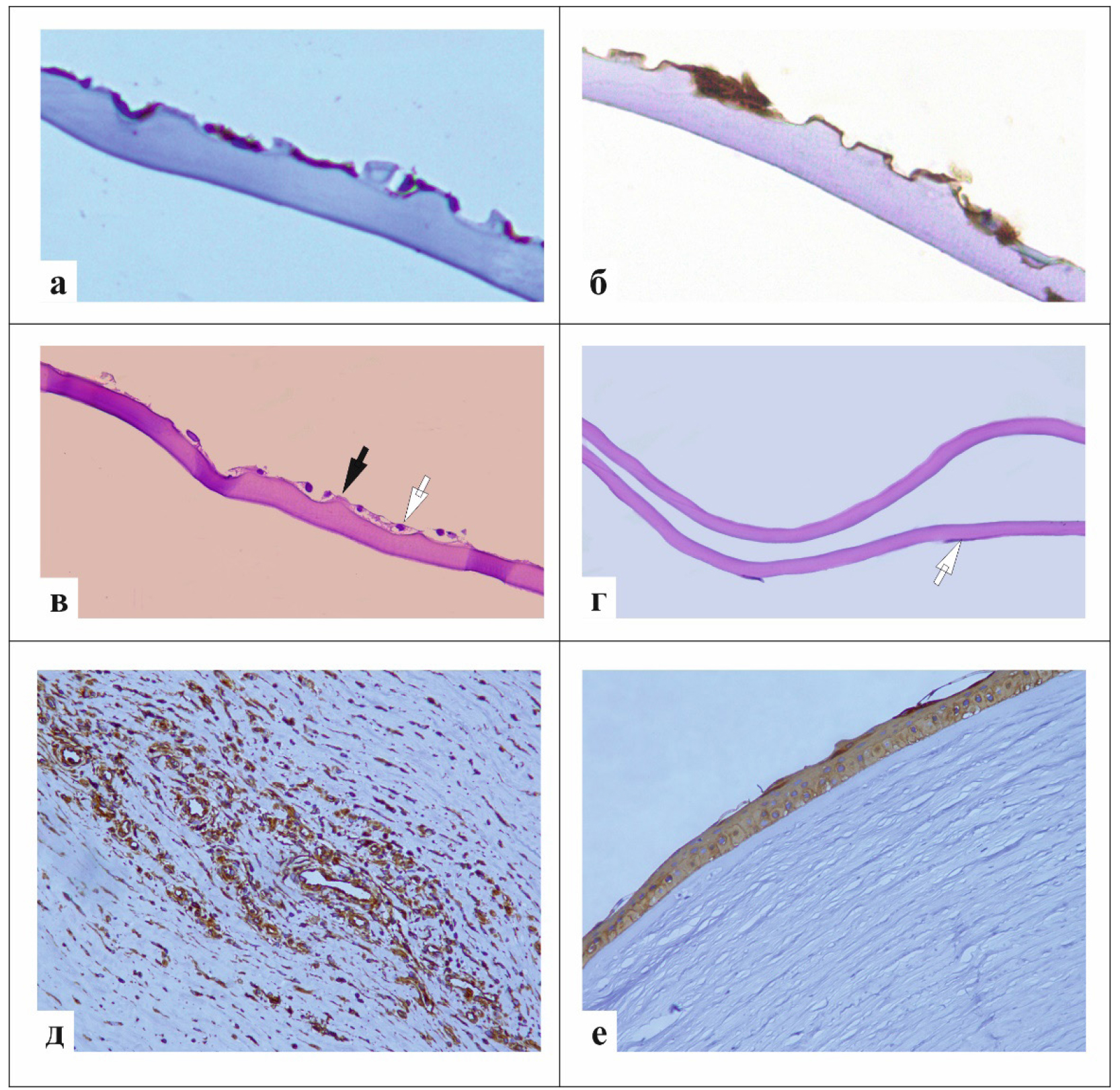 Рис. 1. Роговица при эндотелиальной дистрофии Фукса (ЭД Фукса) и в норме: а – цитокератин AE1/AE3 в эндотелиальных клетках (ЭК) при ЭД Фукса, ×200; б – виментин в ЭК при ЭД Фукса, ×400; в – десцеметова мембрана и ЭК при ЭД Фукса, ×100, гематоксилин и эозин, ЭК (белая стрелка), гутты (черная стрелка); г – десцеметова мембрана и ЭК в норме, ×100, гематоксилин и эозин, ЭК (белая стрелка); д – виментин в клетках стромы при ЭД Фукса, ×200; е – цитокератин AE1/AE3 в эпителиальных клетках при ЭД Фукса, ×200