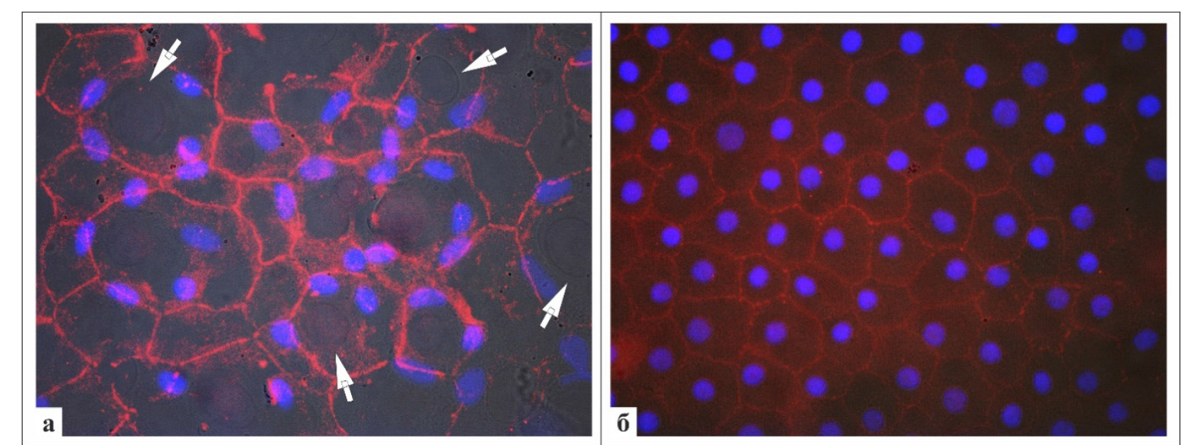 Рис. 2. Эндотелий и десцеметова мембрана при эндотелиальной дистрофии Фукса (а) и в норме (б). Съемка в режиме детекции флуоресценции (белки межклеточных контактов ZO-1 окрашены в красный цвет, ядра – в синий цвет) и фазового контраста (гутты отмечены белыми стрелками); ×630