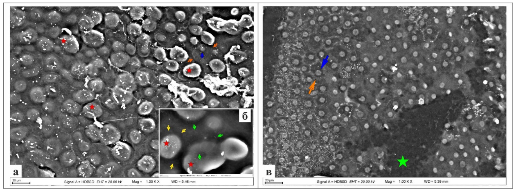 Рис. 3. Изображение эндотелиальных клеток (ЭК) и десцеметовой мембраны при эндотелиальной дистрофии Фукса (ЭД Фукса) и в норме. Сьемка методом сканирующей электронной микроскопии в режиме BSE (а, б – десцеметова мембрана и ЭК при ЭД Фукса: цитоплазматическая мембрана ЭК (оранжевые, зеленые, желтые стрелки), ядро (синяя стрелка), гутта (красная звездочка); в – десцеметова мембрана и ЭК в норме: цитоплазматическая мембрана ЭК (оранжевая стрелка), ядро (синяя стрелка), десцеметова мембрана (зеленая звездочка).