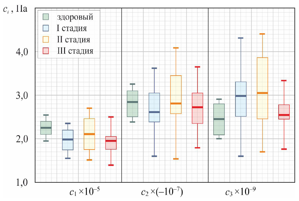 Как видно на рис. 1, за пределами зоны кератоконуса средние расчетные значения параметров упругости c1, c2, c3 для различных стадий заболевания мало отличаются от характеристик здоровой роговицы, практически укладываясь в диапазон стандартного отклонения.