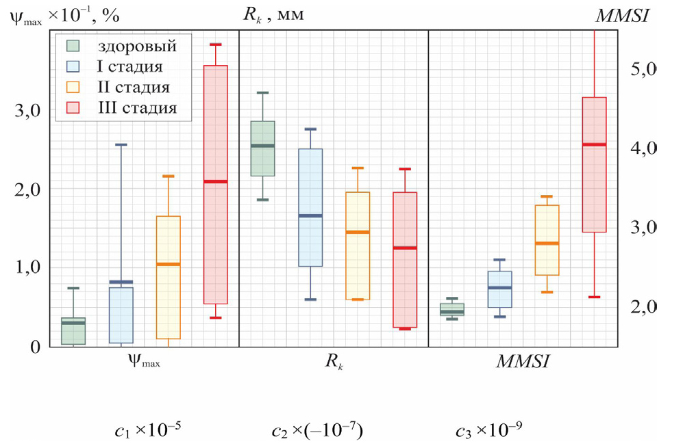 Рис. 2. Значения характеристик зоны пониженной жесткости: коэффициент снижения жесткости ymax, эффективный радиус Rk, отношение максимальной и минимальной интенсивности деформаций MMSI в роговице с кератоконусом различных стадий