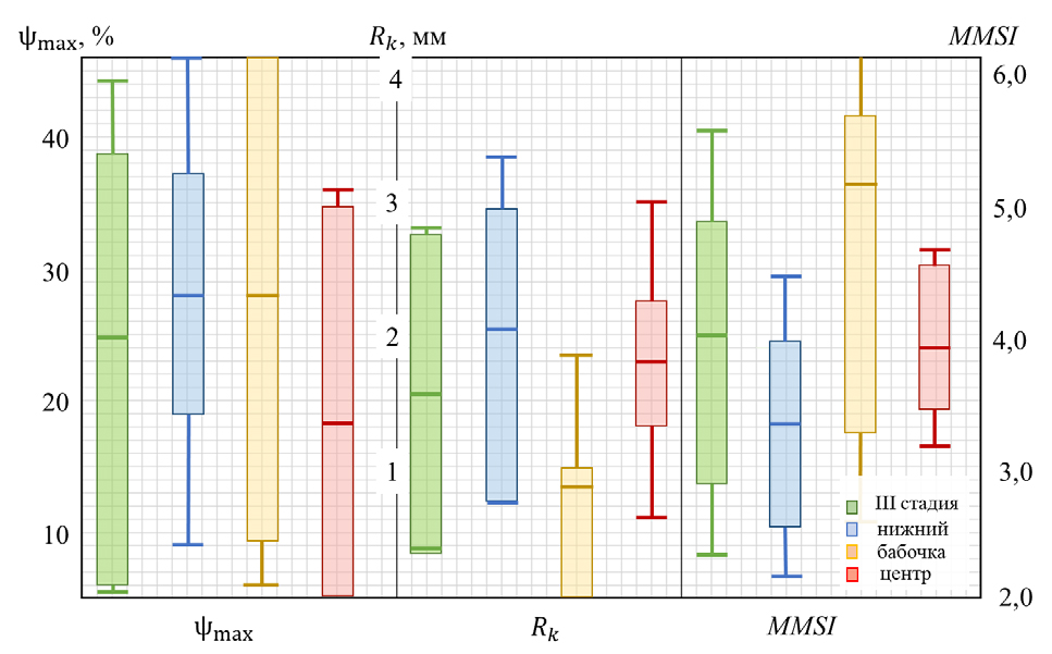 Также расчетные параметры зоны кератоконуса ymax, Rk и MMSI устанавливались для различных паттернов на каждой из рассмотренных стадий заболевания. На рис. 3 приведены результаты статистического анализа результатов моделирования параметров для рассматриваемых паттернов роговиц с кератоконусом 3-й стадии (данные для паттернов типа асимметричный «галстук-бабочка» и изогнутый «галстук-бабочка» объединены в одну группу).