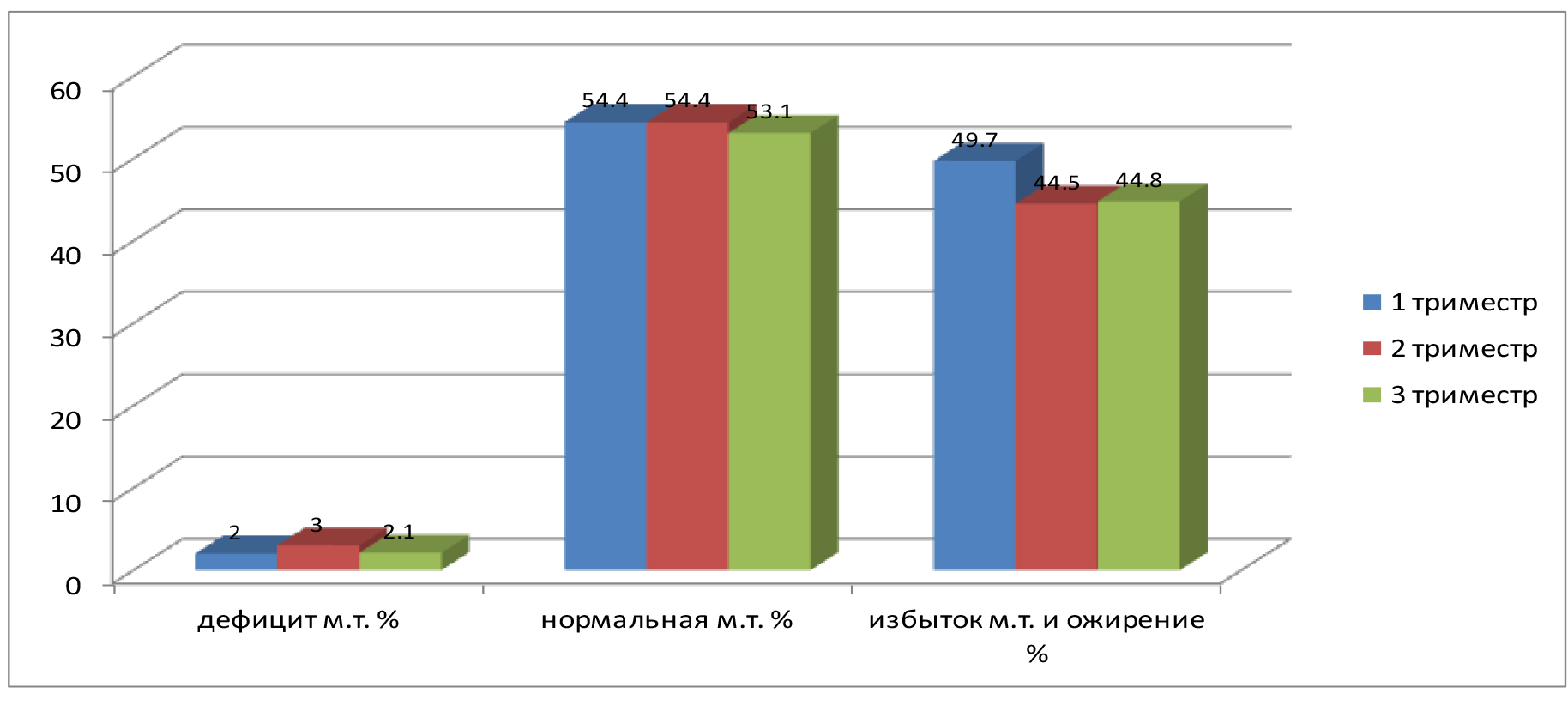 Одним из факторов риска развития ГСД является возраст женщины старше 35 лет [4, 5, 6]. В исследовании средний возраст беременных в первой группе составил (30,8 ± 5,5) года, во второй – (30,5 ± 5,6) года, в третьей – (29,8 ± 5,5) года, что является статистически не достоверным (р = 1,972). Патологическая прибавка массы тела за беременность усугубляет состояние имеющейся физиологической инсулинорезистентности у беременной и может спровоцировать манифестацию ГСД [4, 5, 6]. Прибавка массы тела у беременных в первой группе составила (9,6 ± 4,4) кг, во второй – (10,6 ± 4,1), в третьей – (11,2 ± 4,2) кг, что является статистически незначимым (р = 1,972). Избыточный вес и ожирение – это традиционные факторы риска развития ГСД [4, 5, 6]. Беременные с избытком массы тела и ожирением в первой группе составили 49,7 %, во второй – 44,5 %, в третьей – 44,8 % (см. рис. 1).