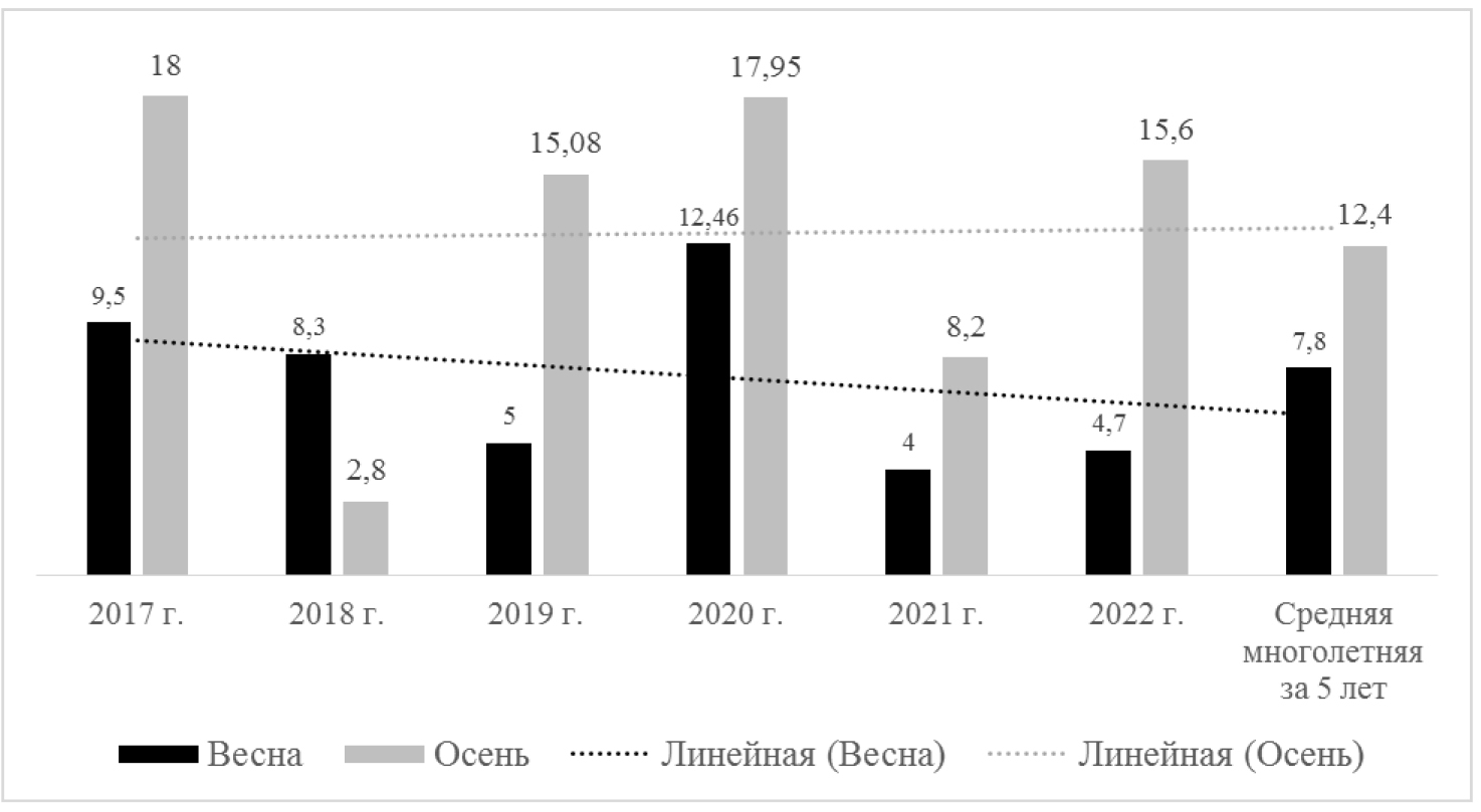 По данным ФБУЗ ЦГиЭ в Волгоградской области численность мелких млекопитающих (ММ) в Вол-гоградской области в зимне-весенний период 2022 г. составила 4,7 на 100 ловушко-ночей, что немного превышает показатель аналогичного периода прошлого года (АППГ) – 4,0, но ниже среднемноголетнего – 7,8 (рис. 1). При этом за зимний период произошло сокращение численности ММ в 1,7 раза. В южных районах и Волго-Ахтубинской пойме средняя численность ММ оказалась незначительно ниже АППГ. В северных районах и в Заволжье средняя численность ММ выше значений АППГ. В летне-осенний период 2022 г. в среднем по области численность ММ составила 15,6 на 100 ловушко-ночей, что выше уровня прошлого года (8,2) и превышает среднемноголетний показатель (СМП) –12,4 (рис. 1).