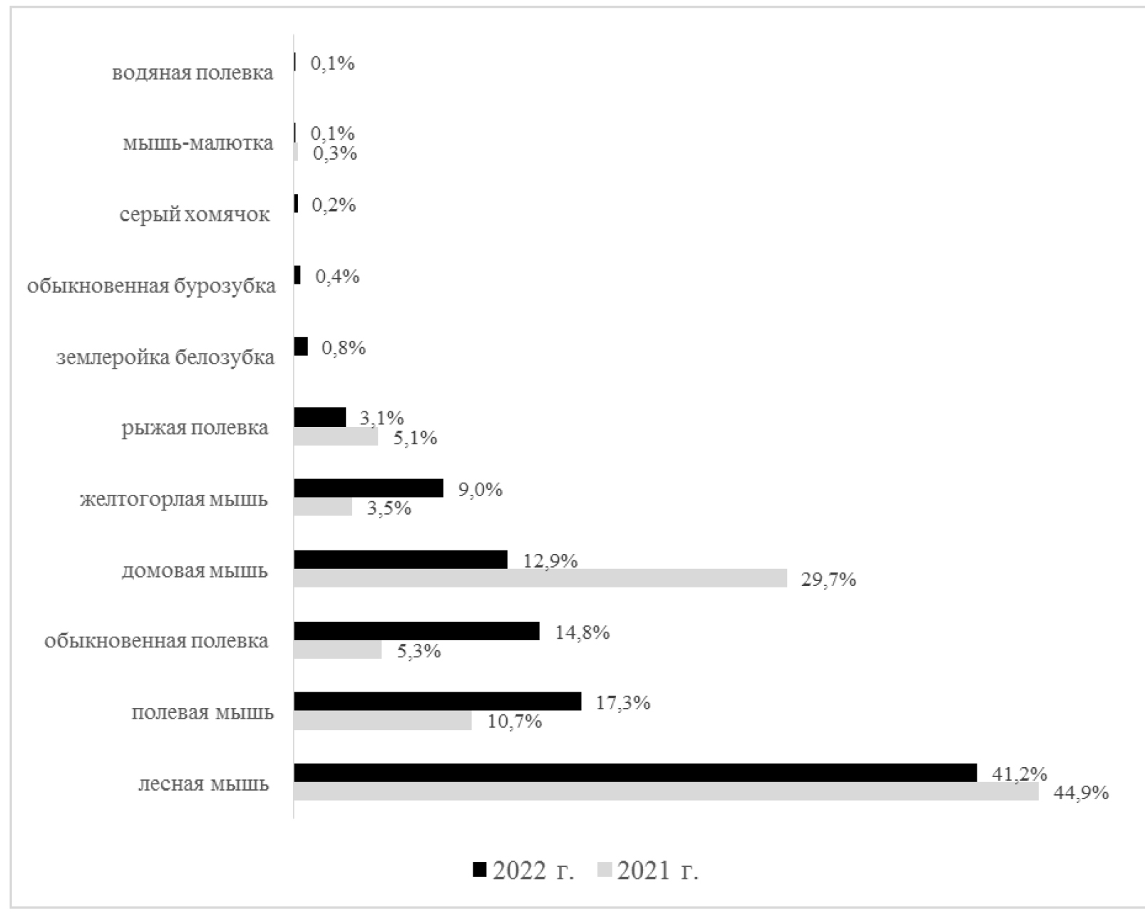 Доминирующим видом, по-прежнему, является лесная мышь – 41,2 %, (АППГ – 44,9 %), содоминантом – полевая мышь – 17,3 % (АППГ – 10,7 %). Среди прочих видов следует отметить значительное снижение доли домовой мыши с 29,7 % в 2021 г. до 12,9 % в 2022 г., рост долей обыкновенной полевки на 9,5 % и желтогорлой мыши на 5,5 % (рис. 2).
