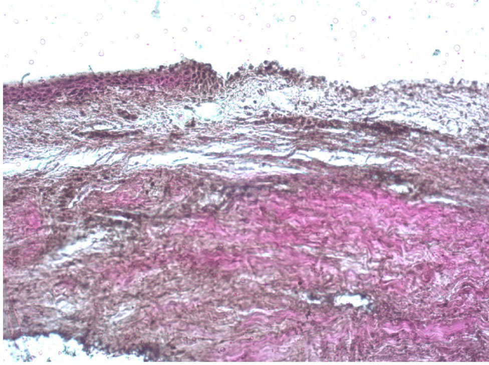 Рис. 6. Роговица свиного кадаверного глаза после проведения частичной эксимерлазерной деэпителизации, окраска по Ван Гизону, об. ×10