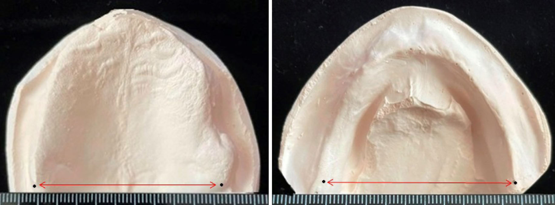 Полученные данные у людей с физиологической окклюзией легли в основу оценки соразмерности ширины лица и альвеолярных дуг у 41 человека с полным отсутствием зубов (основная группа исследования). На моделях заднюю ширину определяли в ретромолярном пространстве (рис. 3).