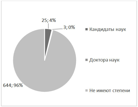 Согласно анкетированию 85,7 % респондентов женщины, большая часть респондентов в возрасте от 35 до 55 лет (55 %) (рис. 1). По критерию основная профессиональная деятельность 33,78 % анкетируемых являлись практикующими врачами, 11,46 % – руководителями в сфере здравоохранения, 54,76 % – это прочие медицинские работники. При учете распределения по уровню МО большая часть респондентов работает на уровне муниципального образования (66,8 %), третья часть (30,1 %) – на региональном, остальные медицинские работники – в организациях федерального уровня (3,1 %). По критерию уровень медицинской помощи, который оказывает организация, подавляющее большинство работает в медицинской организации первого уровня (58,2 %), второго и третьего уровней – 19,5 и 22,3 % соответственно. Анализируя данные респондентов, можно сделать вывод, что 82 % работают больнице (в том числе детской), поликлинике (в том числе детской), специализированной больнице, участковой больнице. Среди респондентов представители 61 специальности: наибольший удельный вес заняли специальности педиатрия 18,30 %, клиническая лабораторная диагностика 10,71 %, лечебное дело 9,08 %, сестринское дело 7,44 %. Из числа опрошенных только 3,57 % имеют специальность «рентгенология», все эти специалисты работают на рентгенографах, некоторые также анализируют маммографию, КТ- и МРТ-изображения. В результате анализа анкет было выявлено, что 4,2 % медицинских работников имеют ученую степень (рис. 2).