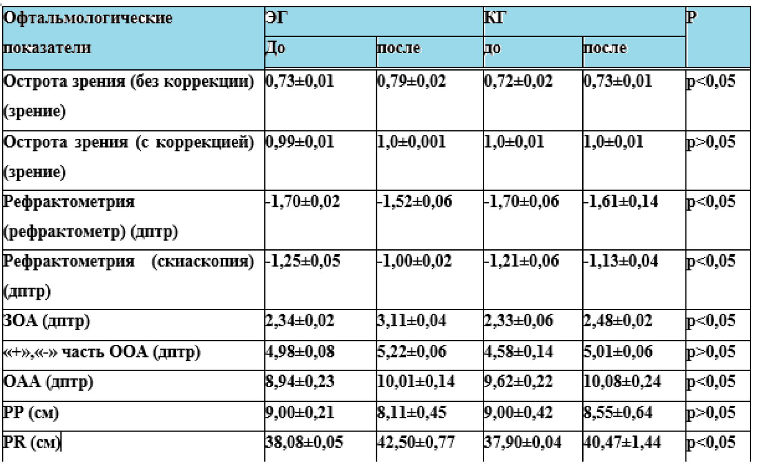 Все показатели, кроме остроты зрения с коррекцией, «–» части ООА и среднего положения ближайшей точки ясного зрения показали значение p-value < 0,05, что было принято как статистически значимое различие.