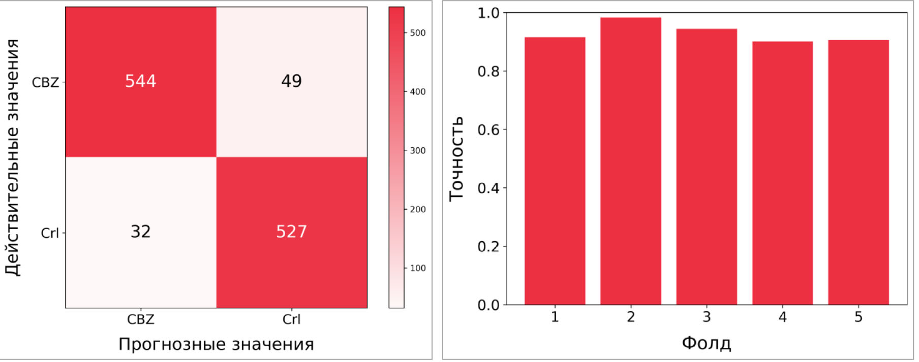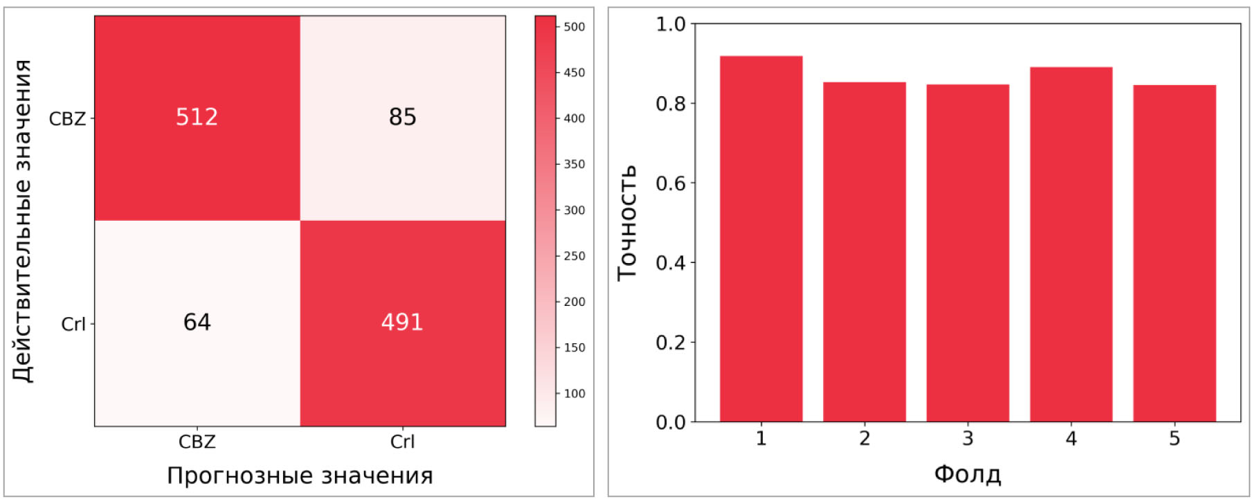 Рис. 3. Матрица несоответствий и результаты 5-кратной кросс-валидации модели WT-CNN на электрокортикографических сигналах проверочной выборки, которые соответствовали двум классам: карбамазепин (25 мг/кг) и контроль (физиологический раствор 1 мл/кг). CBZ – карбамазепин; Crl – контроль