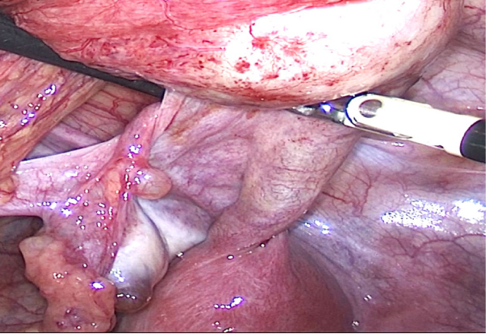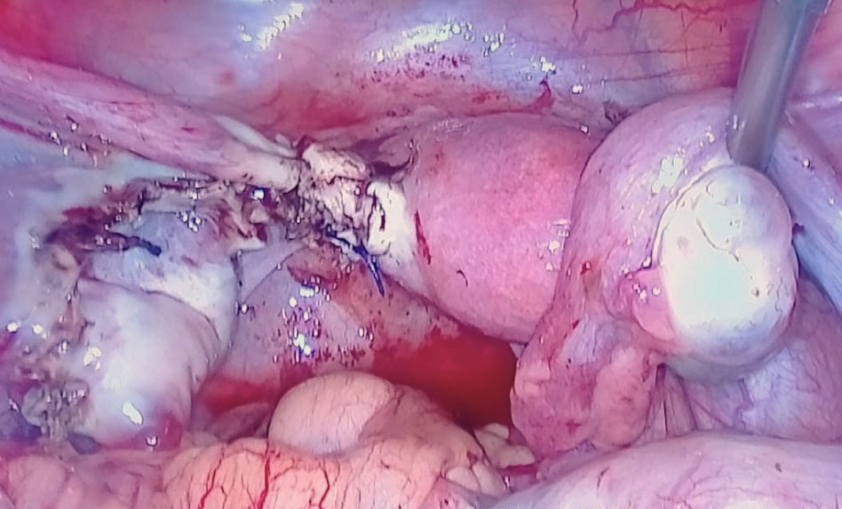 Рис. 4. Диагностическая лапароскопия. Рудиментарный фимбриальный отдел левой маточной трубы, соединенный с гематосальпинксом