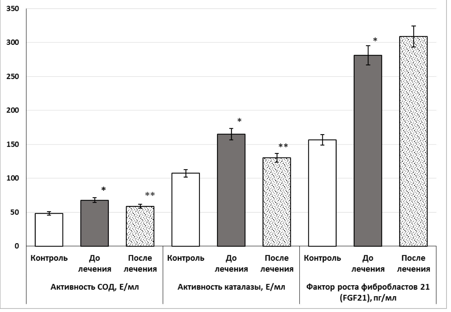 У больных с НАЖБП были выявлены нарушение ферментативного звена антиоксидантной системы и интенсификация воспалительного процесса. В результате проведенного стационарного лечения происходило изменение активности антиокислительных ферментов в сторону нормы. При этом концентрация FGF21 повышалась, что могло свидетельствовать о снижении выраженности воспалительного стресса. Выявленные положительные корреляционные связи между показателями углеводного и липидного обмена, и компонентами ферментативного звена антиоксидантной системы подтверждают сложные системные взаимосвязи между указанными параметрами, в том числе при развитии и прогрессировании НАЖБП. При этом уровень FGF21 имел тесную корреляцию как с нарушениями обмена веществ и маркерами повреждения печени, так и с активностями СОД и каталазы, что говорит, с одной стороны, о взаимозависимости антиоксидантной и противовоспалительной защиты, а с другой – о непосредственном участии данного фактора роста в патогенезе НАЖБП, развивающейся при СД2. Таким образом, определение активностей СОД и каталазы, а также уровня FGF21 может использоваться не только в диагностических целях определения развития окислительного и воспалительного стресса при НАЖБП, но и как маркёры, позволяющие прогнозировать клиническое течение и эффективность лечения данного заболевания.