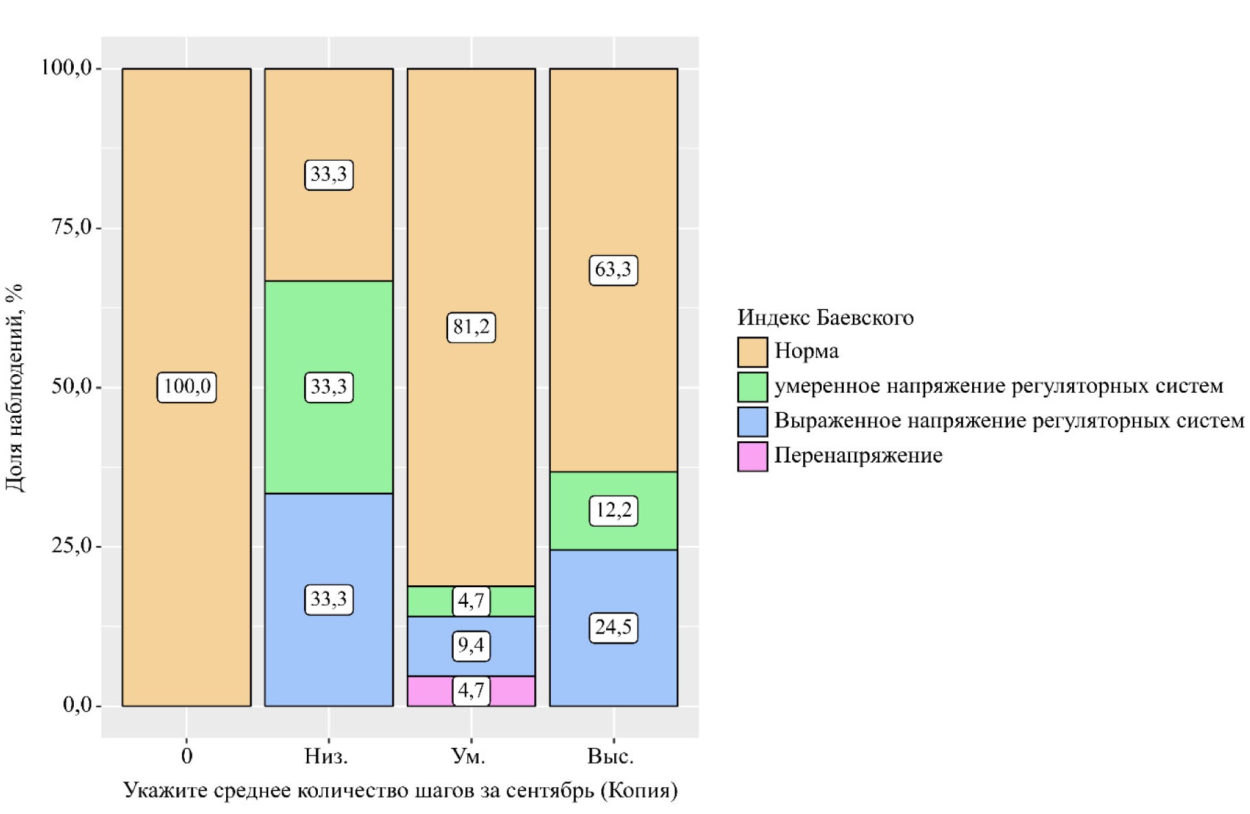 Данные исследования продемонстрировали статистически значимые различия (p = 0,012) в значениях индекса Баевского в зависимости от уровня физической активности студентов. Нормальные значения индекса (70–150 у. е.) были зарегистрированы у 33 % студентов с низкой физической активностью (<5 000 шагов в день), 81,2 % с умеренной активностью (5 000–10 000 шагов в день) и у 63,3 % студентов с высокой физической активностью (10 000+ шагов в день). Умеренное напряжение регуляторных систем (150–300 у. е.) было отмечено у 33 % студентов с низким уровнем активности, 4,7 % – с умеренной и 12,2 % – с высокой. Выраженное напряжение (300–600 у. е.) наблюдалось у 33 % студентов с низким уровнем активности, 9,4 % – с умеренным и 24,5 % – с высоким.