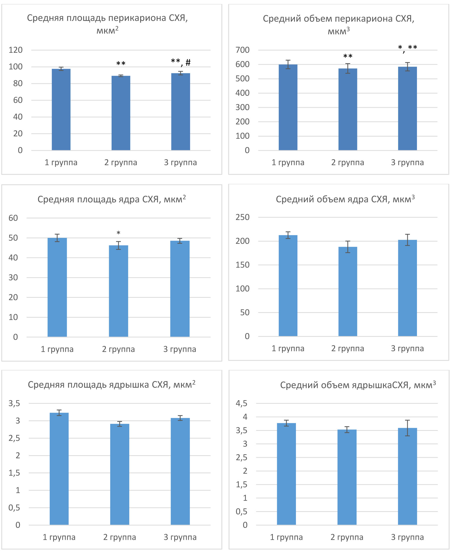 При изучении морфологических особенностей СХЯ гипоталамуса самок крыс контрольной группы выявлено, что все нейроны имели многоугольную форму с округлым или овальным темноокрашенным ядром, занимающим значительную часть перикариона, цитоплазма умеренно базофильная. Ядрышко располагалось центрально и периферически. Средняя площадь перикариона составила (97,56 ± 2,01) мкм2, ядра – (50,01 ± 1,87) мкм2, ядрышка – (3,23 ± 0,08) мкм2. Средний объем перикариона составил (599,43 ± 29,94) мкм3, ядра – (212,5 ± 7,03) мкм3, ядрышка – (3,77 ± 0,11) мкм3.