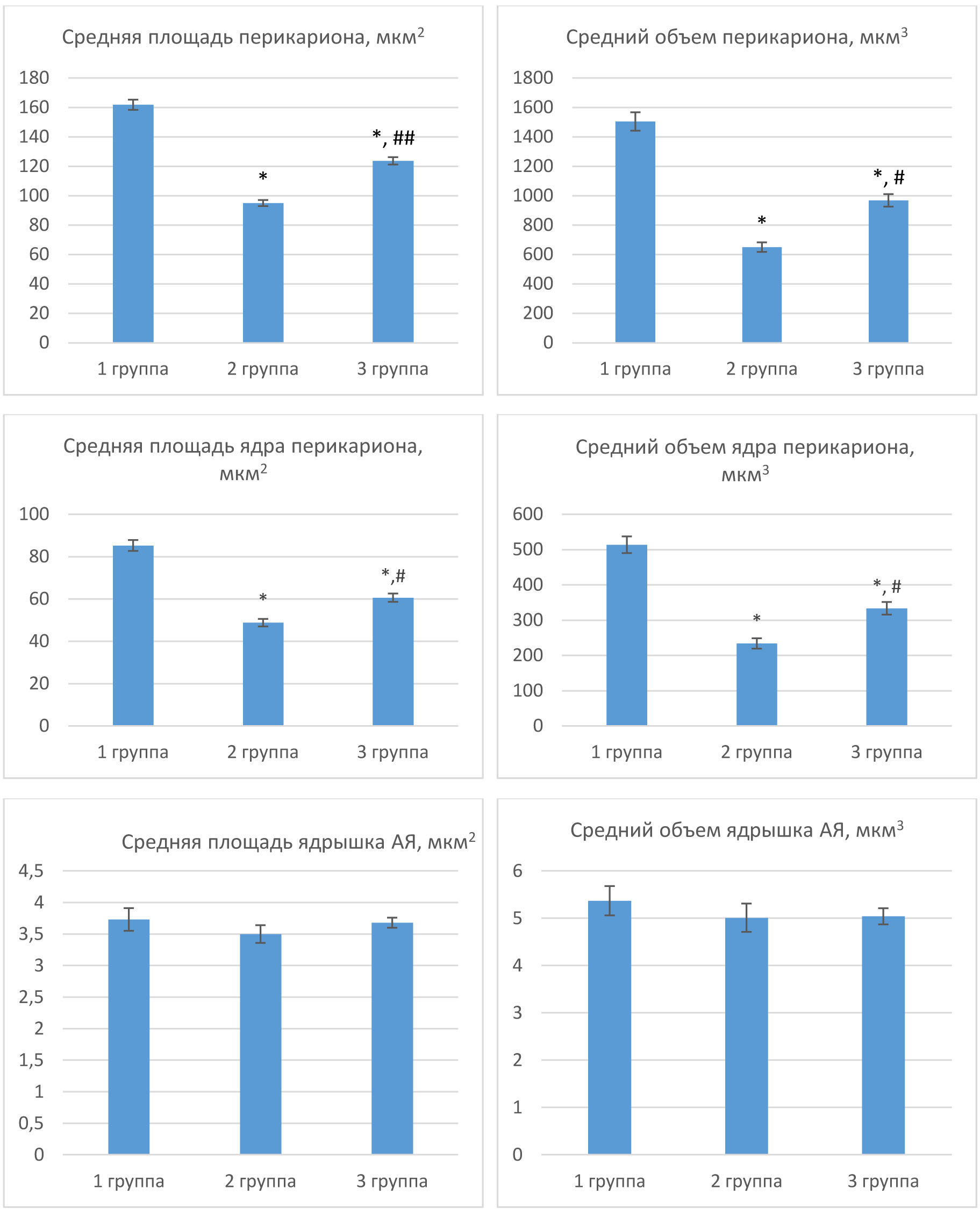 Исследование АЯ гипоталамуса самок крыс контрольной группы показало, что нейроны имели неправильную звездчатую форму с центрально расположенными ядрами, цитоплазма умеренно базофильная. Ядрышко располагалось центрально и периферически. Средняя площадь перикариона составила (161,8 ± 3,48) мкм2, ядра – (85,21 ± 2,57) мкм2, ядрышка – (3,73 ± 0,18) мкм2. Средний объем перикариона составил (1504,0 ± 62,82) мкм3, ядра – (513,5 ± 23,49) мкм3, ядрышка – (5,37 ± 0,31) мкм3.