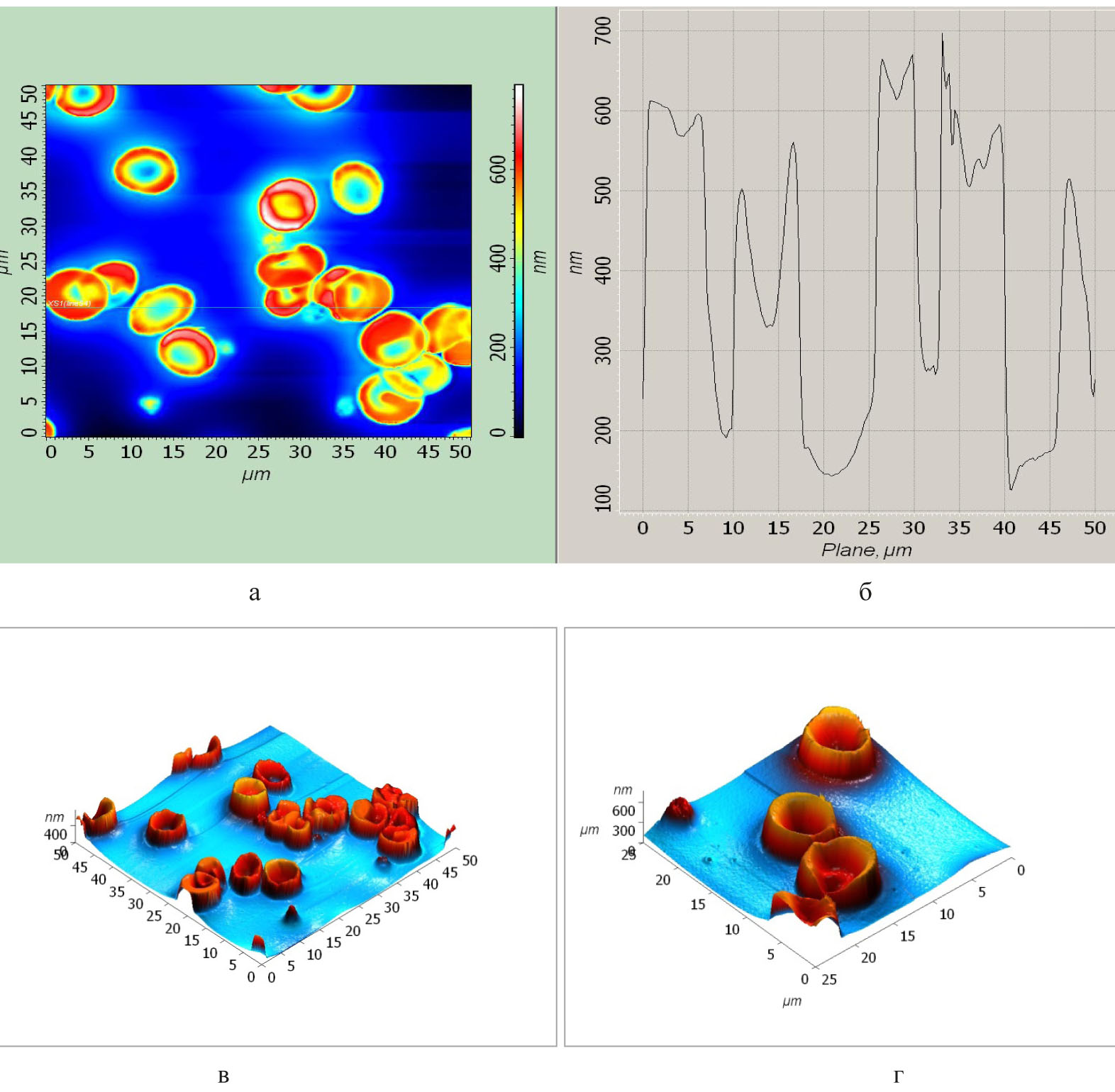 Рис. 1. Эритроциты больного с СД 2-го типа при атомно-силовой микроскопии: а – гемолиз в отдельных клетках, форма части клеток изменена, глубина их полости увеличена; б – графическое изображение рис. 1а (двухмерное изображение); в – трехмерное изображения структуры эритроцитов; г – фрагмент рис. 1в