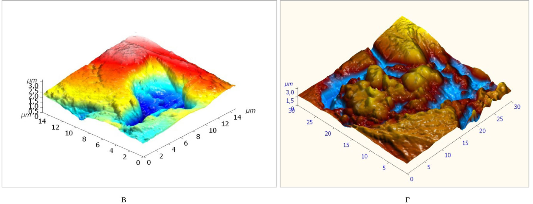 Рис. 3 (окончание). Фрагменты миометрия матки женщин с СД 2-го типа. Начало образования тромба в спиральной артерии матки (а, б, в) и его наличие (г). Атомно-силовая микроскопия. В – трехмерное изображение; г – трехмерное изображение