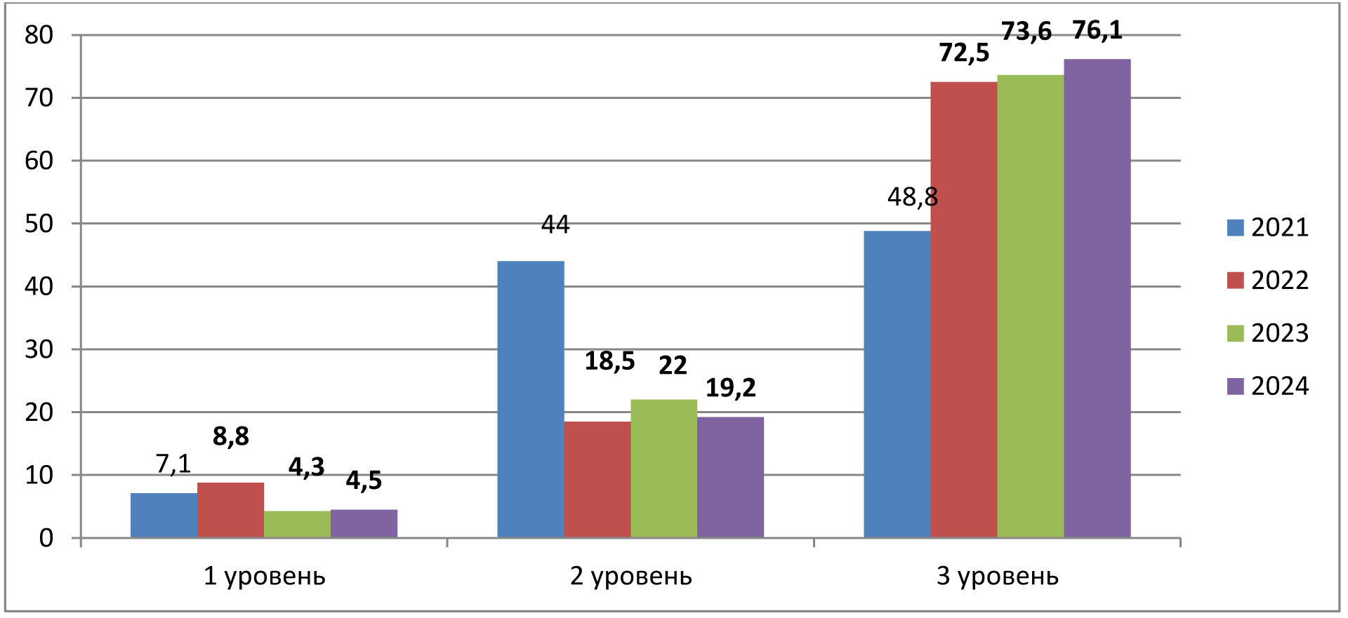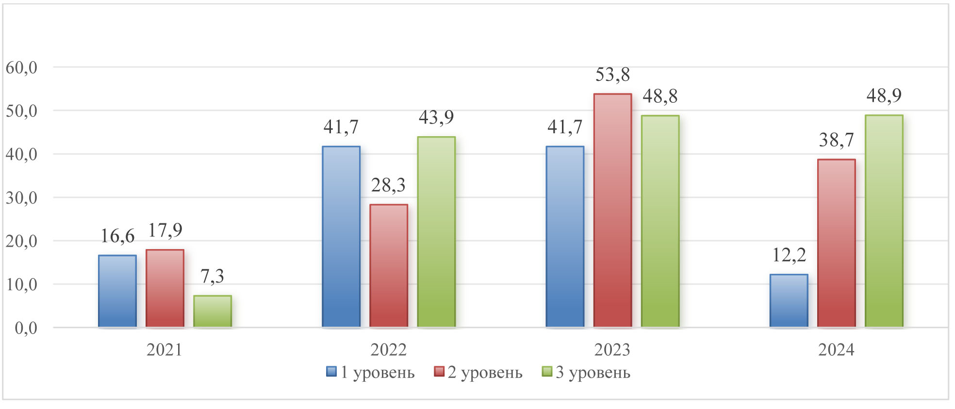 Анализ структуры уровня оказания помощи пациенткам с КАС в Волгоградском регионе за период 2021–2024 г. показал, что развитие КАС в стационарах 1-го уровня уменьшилось в 1,7 раза, что свидетельствует о своевременной маршрутизации пациенток высокой группы риска осложнений. При этом обращает на себя внимание практически равное количество случаев КАС на 2-м и 3-м уровнях в 2021 г. В то время как к 2024 г. это соотношение изменилось и составило 1 : 3,4 (число случаев оказания помощи на 3-м уровне увеличилось в 3,4 раза) (рис. 1, 2).
